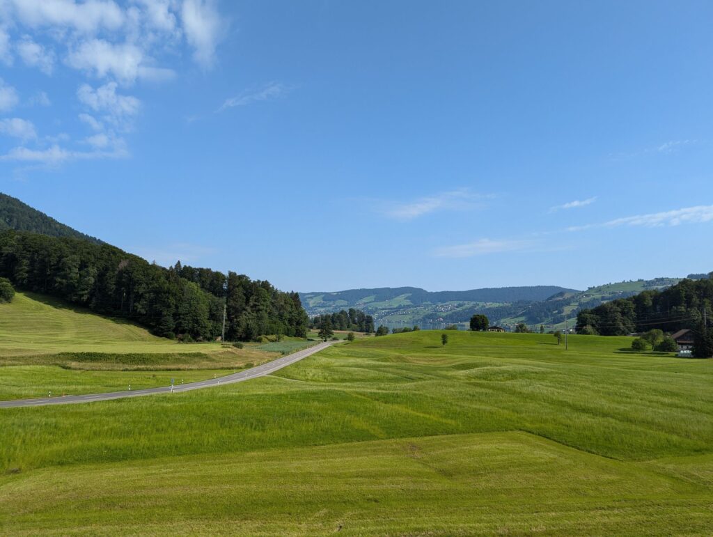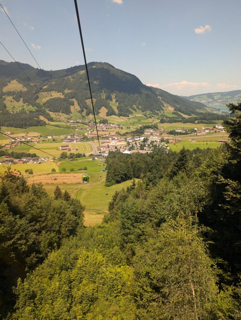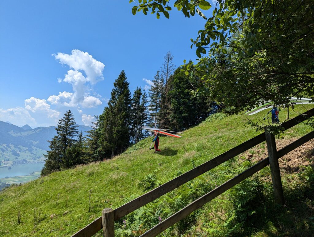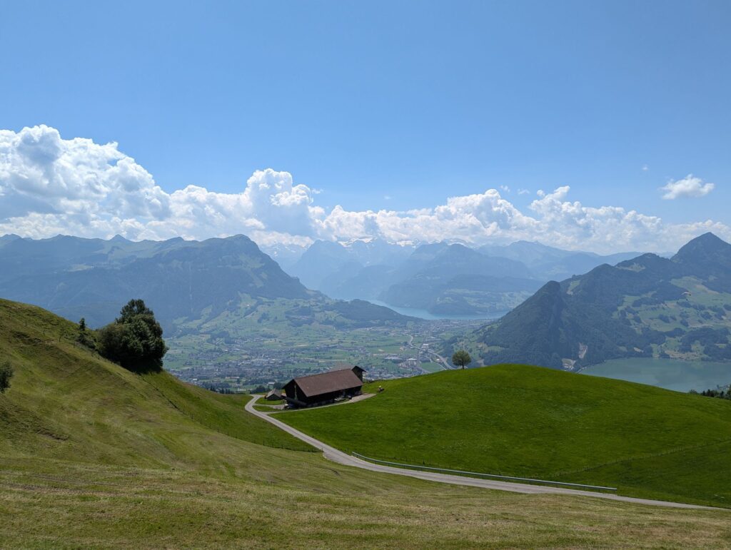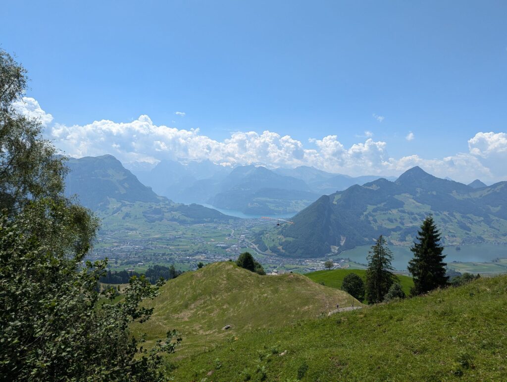After crossing we decided to follow one of the suggested routes and went up the mountain. Our efforts were rewarded with a great view of the town of Schwyz and Brunnen in the distance. Next to our spot some paragliders were about to take off. After this break we continued our journey and went back down the mountain to the station.
