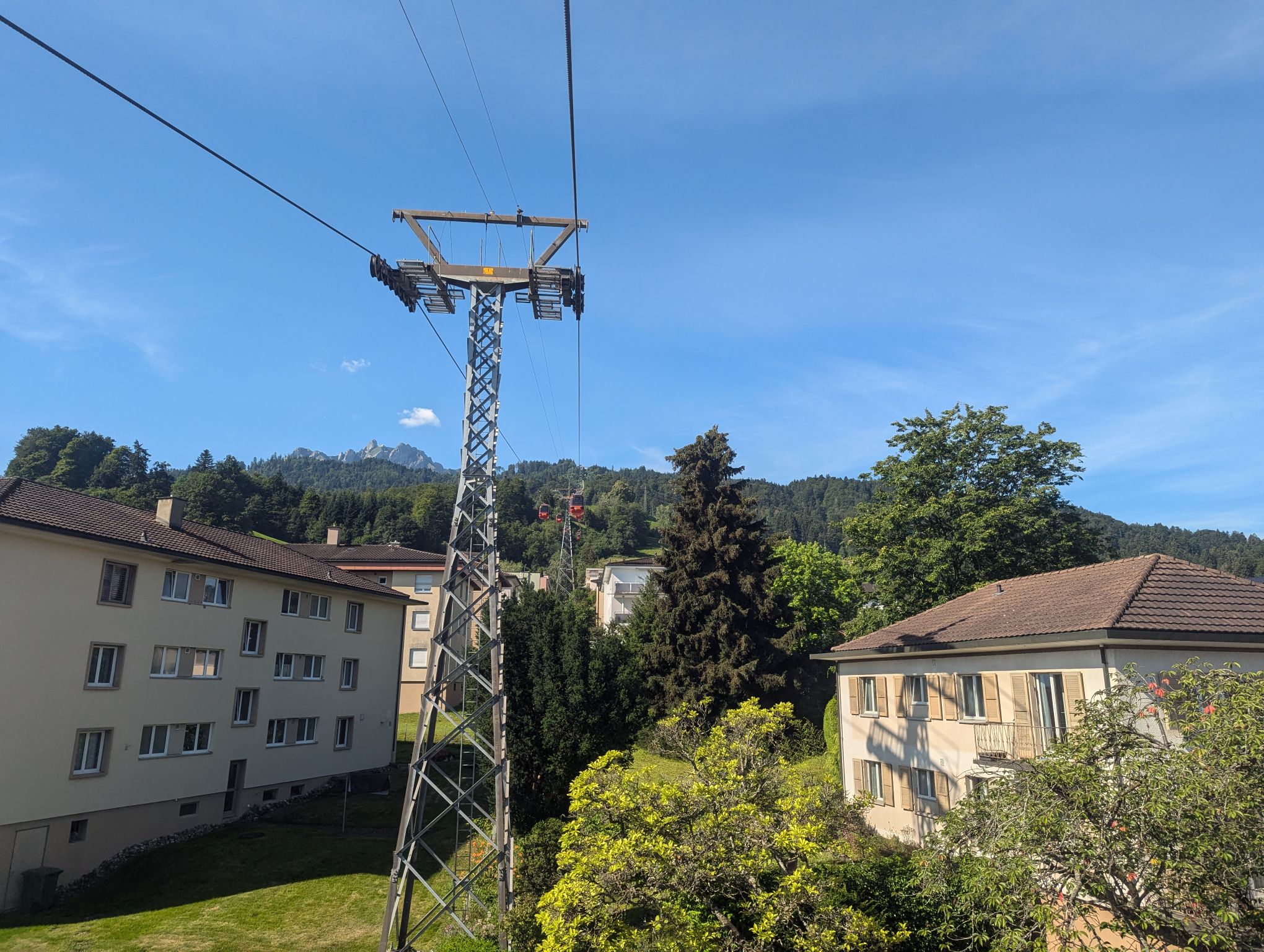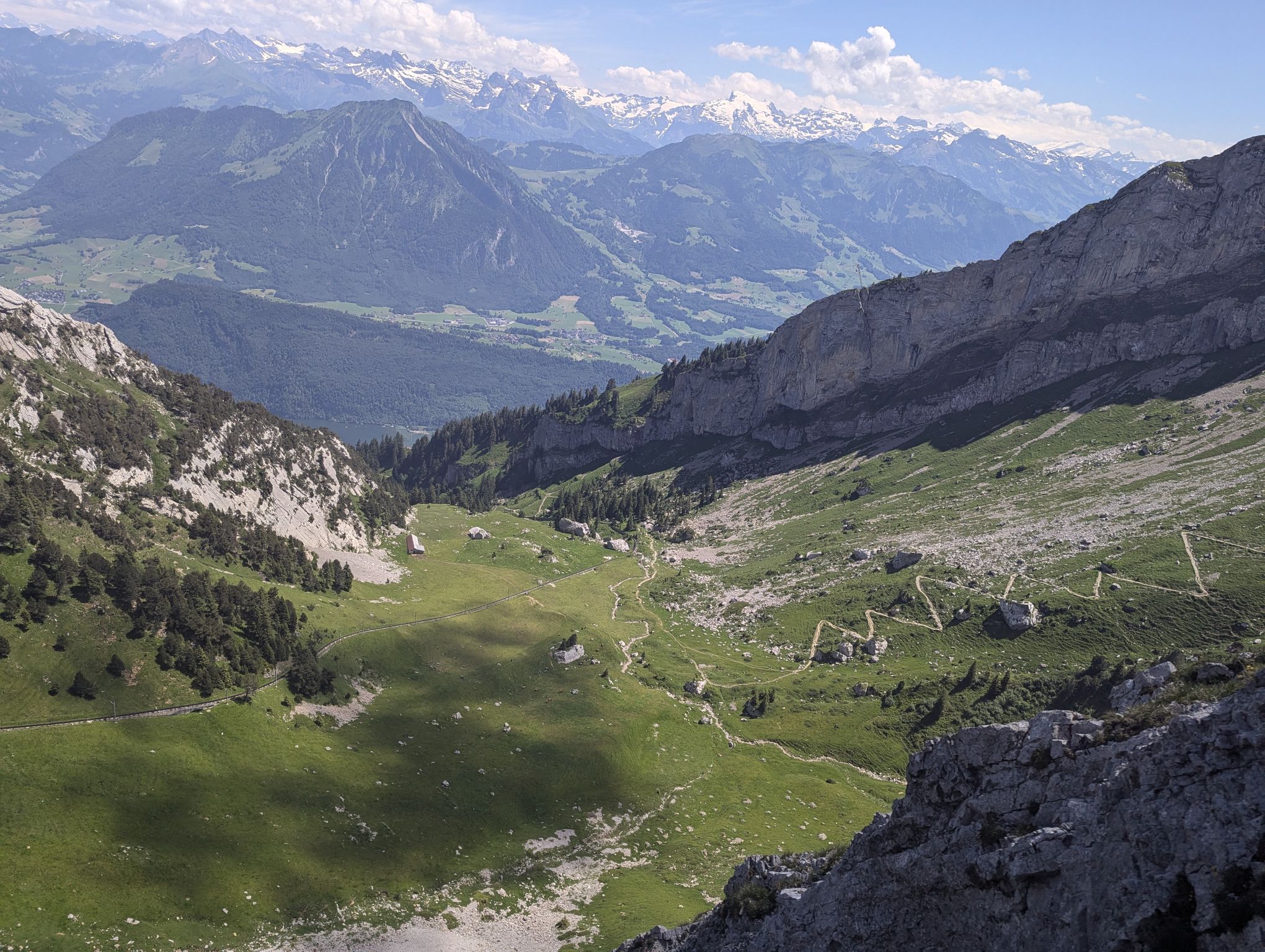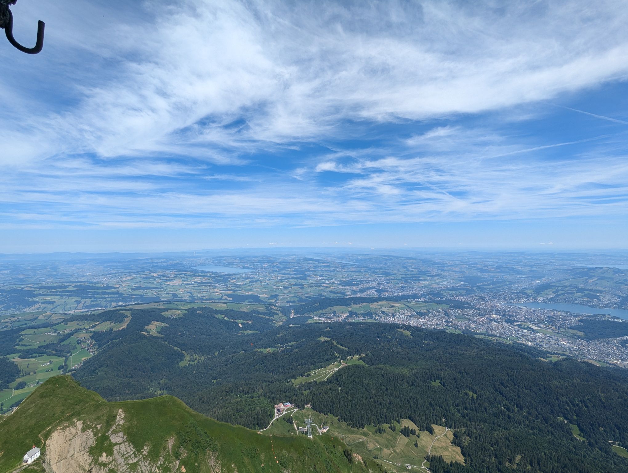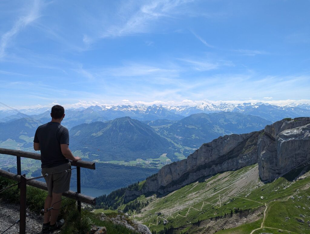 After crossing we decided to follow one of the suggested routes and went up the mountain. Our efforts were rewarded with a great view of the town of Schwyz and Brunnen in the distance. Next to our spot some paragliders were about to take off. After this break we continued our journey and went back down the mountain to the station.