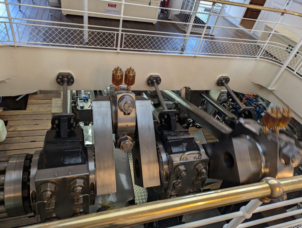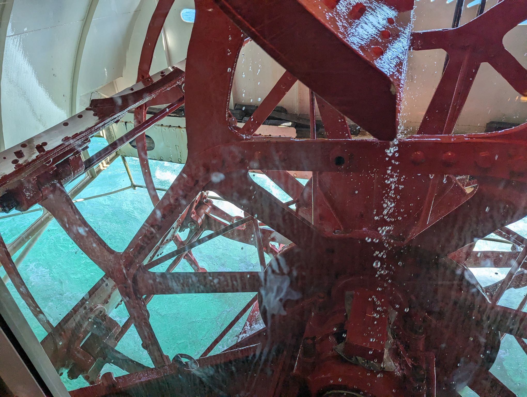 The boat was an old but restored canoe, and from the main area you could look down into the engine room and marvel at the pistons as they moved. Like little children, we peered down at the moving hunks of metal. But not only the engine was in action, you could also see the paddle blades in action through a small window. In motion, it looked like a dishwasher in action. The tour took about 1.5 hours and during that time we were overtaken by several trains along the lake shore.